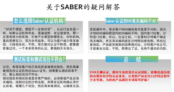 “Saber认证”,是SASO沙特标准局推出的一个新的在线申请清关证书系统,Saber实际就是一个网络工具,用于产品注册、发行和获取符合性COC证书,COC证书=PC证书+SC证书或COC证书=自我声明证书+SC证书,以便于沙特进口商快速清关,沙特Saber清关系统和沙特fasah海关系统已经互通数据……